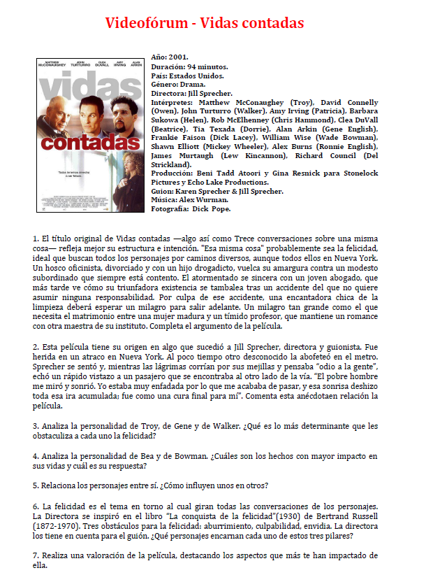 VIDAS CONTADAS (2001). PELÍCULA. el marzo 28, 2021 Obtener enlace Facebook X Pinterest Correo electrónico Otras aplicaciones Vidas contadas (2001). Película. Valores (felicidad)Duración: 94 minutos.Autoría fichas: Carlos Javier Alonso.Coordinador de la actividad.Profesor de Filosofía del IES Ordoño II. Comentarios
